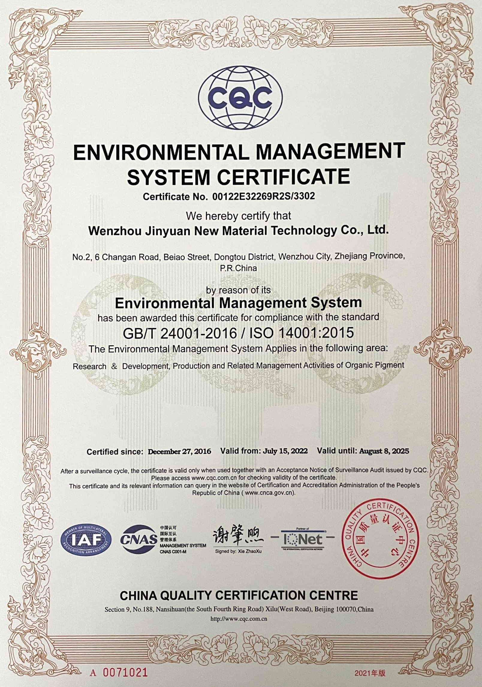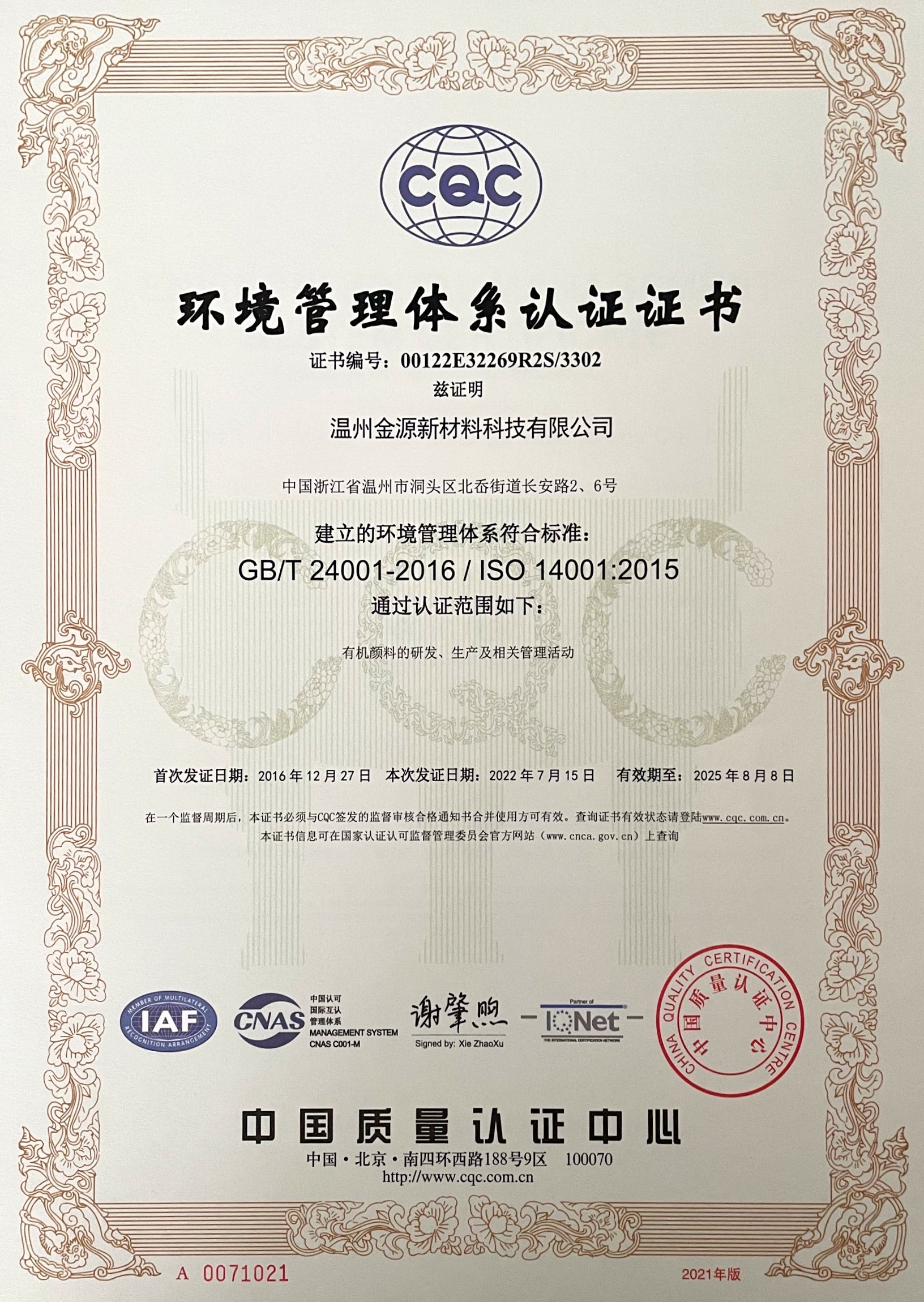 環境管理體系認證證書