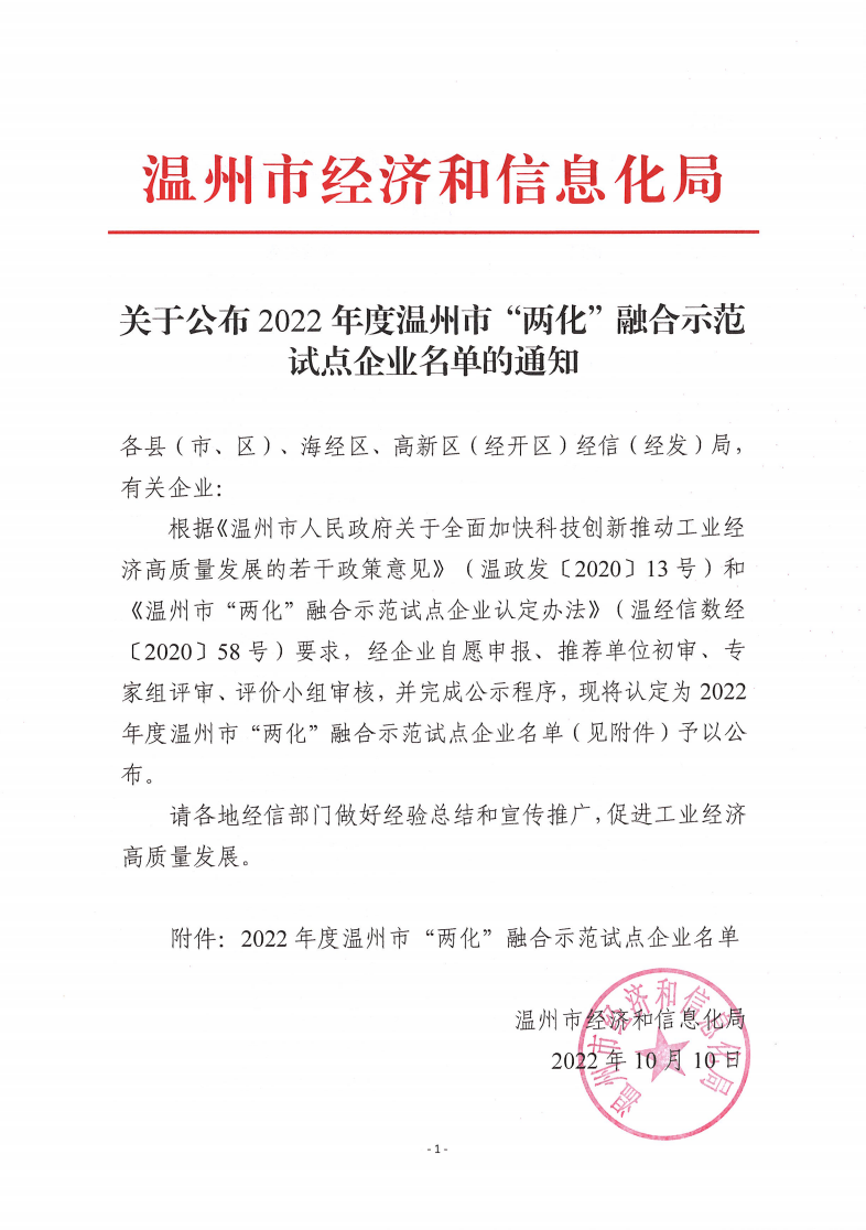 關于公布2022年度溫州市“兩化”融合示範試點企業名單的通知